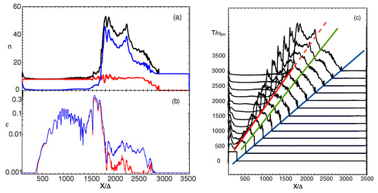 Figure 1a,b shows the average (in the plane) of (a) the jet (red), the ambient (blue), and the total (black) electron density, and (b) the electromagnetic field energy divided by the total jet kinetic energy ( at . Here, “e” and “p” denote the electron and positron. Positron density profiles are similar to the electron profiles, as both particles have the same mass. However, for the electron-ion jets, the densities of the electrons and the ions are slightly different, giving rise to double layers in the plasma [21,22,23]. As a result, ambient particles are dragged by the motion of the jet particles up to ∼500. By , the ambient density has evolved into a two-step plateau behind the jet front, which is similar to the electron-ion jet cases [21,22,23]. The maximum density in this shocked region is about three times the initial ambient density. The jet-particle density remains nearly constant up to near the front of the jet. Careful comparisons reveal the differences between the pair jets and the electron-ion jets [21,22,23]. The differences arise due to the double layers generated in the trailing and leading edges in the electron-ion jets.