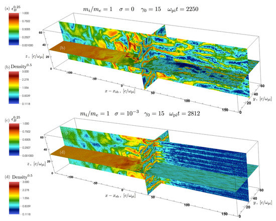 Their 3D structure is shown in Figure 2, for a relativistic electron-positron shock with magnetization (top panel) and (bottom panel). The background magnetic field is initially set along the z-direction, in the same way as for our 2D simulations. The slice of the magnetic energy fraction in Figure 2c shows that for , the magnetic field ahead of the shock is primarily organized in pancakes stretched in the direction orthogonal to the background magnetic field (i.e., along y). This can be easily understood, considering that the Weibel instability is seeded by focusing the counter-streaming particles into two channels of charge and current. In the absence of a background magnetic field, the currents tend to be organized into cylindrical filaments, as demonstrated by Spitkovsky [41] and shown in the slice of the top panel in Figure 2. In the presence of an ordered magnetic field along z, the particles will preferentially move along the magnetic field (rather than orthogonal), so that their currents will more likely be focused at certain locations of constant z, into sheets elongated along the plane. This explains the structure of the magnetic turbulence ahead of the shock in the bottom panel of Figure 2, common to all the cases of weakly magnetized shocks they have investigated (i.e., ).