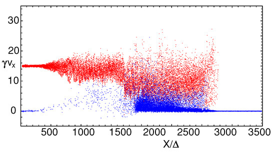 Phase-space distribution of the jet (red) and the ambient (blue) electrons at . About 18,600 electrons of both species are selected randomly. Adapted from Figure 2 in [18].