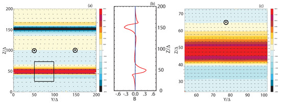 Figure 4a shows the structure of the component of the magnetic field in the plane (jet flows out of the page) at the midpoint of the simulation box, where . Figure 4b depicts 1D cuts along the z axis showing the magnitude and direction of the magnetic field components at the midpoint of the simulation box, where and for the case at the simulation time , with [55]. In the case, magnetic fields appear relatively uniform at the velocity shear surfaces along the transverse y-direction, just as it had been at the velocity shear surfaces along the parallel x-direction, with almost no transverse fluctuations visible in the magnetic field structure. Small fluctuations in the y-direction over distances on the order of ∼ are visible in the currents, whereas small longitudinal mode fluctuations in the x-direction occur over distances ∼. This behavior indicates that the MI generates DC fields in the transverse direction, a fact that has also been seen in the results of global jet simulations without helical magnetic fields [56].