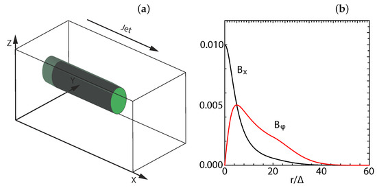 Here, the center of the jet is located at and . The chosen helicity is defined through Equation (3), which has a left-handed polarity with positive . At the jet orifice, the helical magnetic field is implemented without the motional electric fields. This corresponds to a toroidal magnetic field generated by jet particles moving along the -direction.