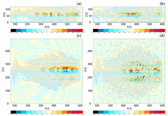 Isocontour plots of the azimuthal component of magnetic field intensity at the center of the jets for (a,c) (b,d) jets; with (a,b) (c,d) at time . The disruption of helical magnetic fields are caused by instabilities and/or reconnection. The max/min numbers of panels are (a) ±2.645, (b) ±2.427, (c) ±3.915, (d) ±1.848. Adapted from Figure 1 in Nishikawa et al. [62].