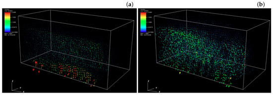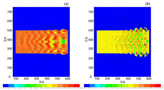 To illustrate the production of acceleration of the particles in the jet, the Lorentz factor of the jet electrons was plotted for the two cases of plasma type used ( and , respectively) when the jet radius is , as it is shown in Figure 8. These observed patterns of the Lorentz factor coincide with the changing directions of the local magnetic fields in the y-direction, which are generated by kinetic instabilities like the Weibel instability, the kKHI, and the MI. The directions of the magnetic fields are indicated by the arrows (black spots) in the plane. (The arrows are better seen when the figure is magnified.) The directions of magnetic fields are determined by the generated instabilities. The structures at the edge of the jets are generated by the kKHI. Moreover, the plots of the Lorentz factor in the plane, which are not presented here, show the production of the MI at the circular edge of the jets.