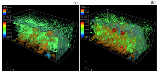 Panels show 3D isosurface plots of the Lorentz factor of the jet electrons for (a) and (b) jet with at time . The lines show the magnetic field stream lines in the quadrant of the front part of the jets. The color scales for contour (upper left): red 20.0; orange 13.67; right blue . blue 1. The color scales of streaming lines (a) (5.92, 3.52, 0.174, , ) ; (b) (3.96, 2.21, , , ) . Adapted from Figure 4 in Nishikawa et al. [62].