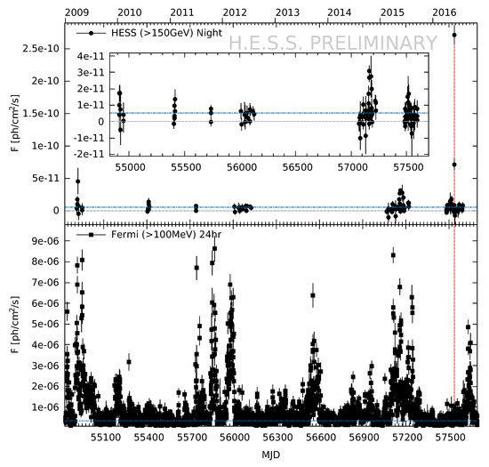 Nightwise binned fluxes from 2009 to 2016 in the VHE band taken with H.E.S.S. (top panel) and the HE band taken with Fermi-LAT (bottom panel). The inset shows a zoom in on VHE fluxes without the 2016 flare. The blue dash-dotted line marks the average flux, while the gray dashed line marks the zero-flux level. The vertical red dashed line marks the time of the VHE flare in 2016.