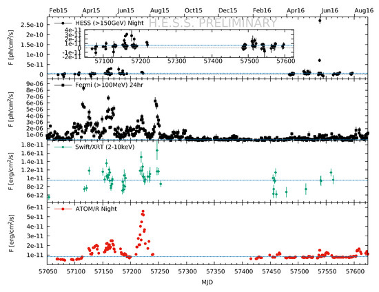 - Cerruti, M.; Böttcher, M.; Chakraborty, N.; Davids, I.D.; Füßling, M.; Jankowsky, F.; Lenain, J.P.; Meyer, M.; Prokoph, H.; Wagner, S.; et al. Target of opportunity observations of blazars with H.E.S.S. AIP Conf. Proc. 2017, 1792, 050029. [Google Scholar]