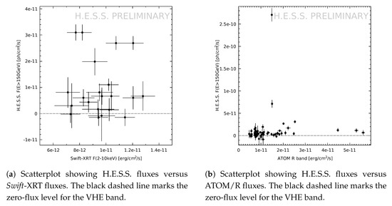 Scatterplots have also been produced for VHE versus X-ray and VHE versus R-band fluxes, which are shown in Figure 4a,b, respectively. As the number of data points are low, no DCCFs have been calculated. No conclusions can be drawn from the VHE versus X-ray scatterplot at this point. Unfortunately, no X-ray coverage was obtained during the 2016 VHE flare. The VHE versus R-band scatterplot suggests that high optical fluxes (i.e., above erg/cm/s) imply significant VHE fluxes (i.e., fluxes that deviate by more than 1 from zero). The low number of data points makes this a weak conclusion. However, high VHE fluxes do not imply high optical fluxes (using the same threshold), as is demonstrated by the 2016 VHE flare.