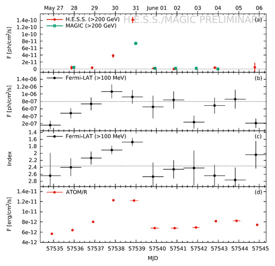 A detailed lightcurve of the maximum night is shown in Figure 6. The VHE flux exhibits a peak with a flux ∼80% of the Crab above an energy of GeV and a subsequent decay. From the peak to the minimum the flux fell by almost an order of magnitude. As the low flux in the HE band coupled with the small effective area of Fermi-LAT inhibits short-time binning, individual photons recorded with Fermi-LAT with energies GeV are shown in the second panel. Fermi-LAT recorded photons with energies up to GeV during the H.E.S.S. observation window, but only 2 photons with energies GeV in the MAGIC observation window. This is indicative of a softening of the spectrum at that time. The optical R-band flux recorded with ATOM exhibits a double-peaked structure, which is different than the VHE -ray lightcurve. The optical flux only changes by ∼30%.