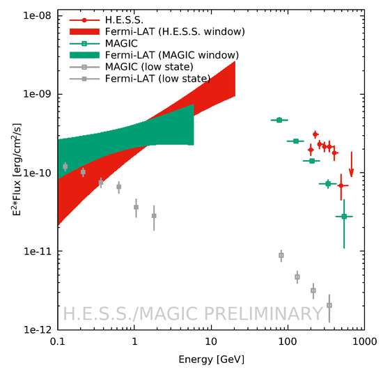 The -ray spectra of the maximum night are shown in Figure 7 along with the HE and VHE -ray low-state spectra [16]. The VHE -ray spectra have been corrected for the absorption by the extragalactic background light (EBL) using the model of [21]. The resulting deabsorbed spectra of the flare are compatible with power-laws with indices and , respectively. The HE -ray spectra in the two VHE observation windows are compatible within errors being during the H.E.S.S. time frame and during the MAGIC time frame, respectively. The spectral breaks between the HE and the VHE -ray band are, therefore, during the H.E.S.S. time frame and during the MAGIC time frame. The comparison with the low-state data clearly shows the significant shift of the peak energy from MeV to GeV during this flare.