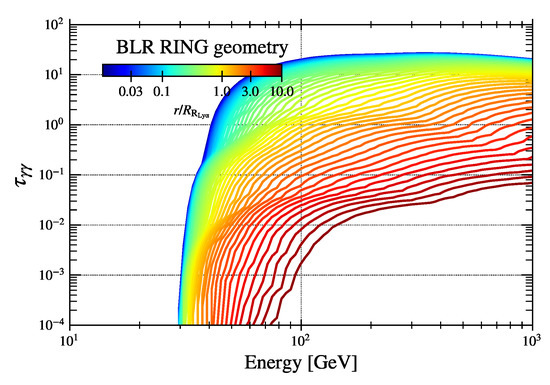 The optical depth as a function of -ray energy in the incident photon field of the BLR. The colors refer to different distances r along the jet with respect to the distance cm of the Ly line.
