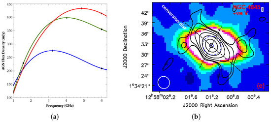 The galaxy, NGC 4845. (a) spectrum of the AGN in NGC 4845 from three different time steps, the earliest in red (T1), T1 + 56 days in green, and T1 + 196 days in blue, from [14]. (b) Contours of Stokes V over total intensity image in colour at L-band, from [16]. The beam is shown at the lower left.