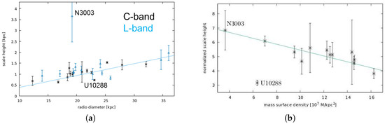 Galaxy-scale height correlations from [27]. (a) Scale heights increase with the radio diameter of the galaxy. (b) Normalized scale heights decrease with the mass surface density of the underlying disk.