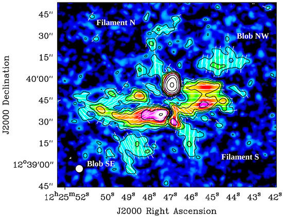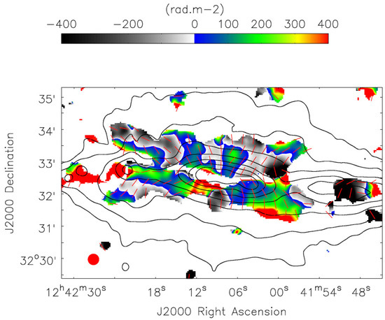 In the case of this Virgo galaxy, the sensitivity provided by the use of the RM-synthesis technique on our C band-C configuration data [41] was key to revealing a large number of new faint features in the halo (Figure 7). With an exceptionally low rms noise of 2.3 Jy/beam and a resolution of 5.33 arcsec in polarized intensity, we are also able to resolve some interesting features of the disk never seen before.