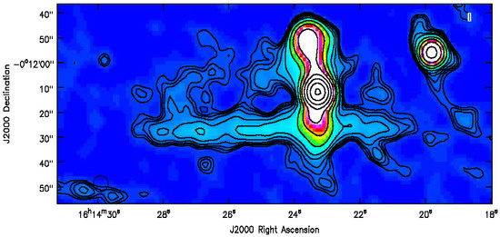 UGC 10288 (Figure 5) was studied in some detail early in the project [37]. For this galaxy, we combined all five total intensity data sets to obtain a single image at a frequency intermediate between L-band and C-band (4.1 GHz). The fact that in-band spectral index fitting occurred at every position in the galaxy (Section 1.2) allowed such a combination to be carried out.