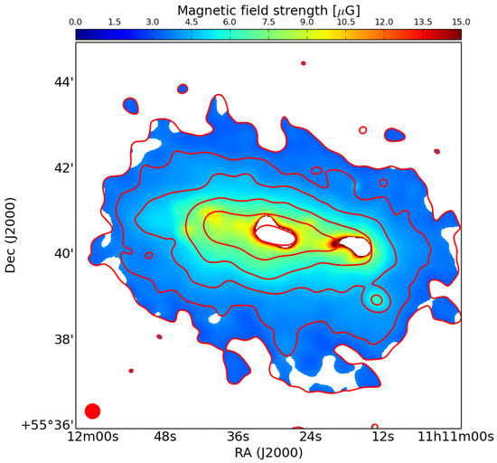 Total power results from CHANG-ES observations of NGC 3556 were combined with results from 144 MHz observations carried out using the Low Frequency Array (LOFAR) [29]. These data were taken as part of the LOFAR Two-metre Sky Survey (LoTSS) [42]. The combined results were used to calculate the spectral index between L-band and 144 MHz and the magnetic field strength in the galaxy using the equipartition approach by [43]. This showed that the disk of the galaxy has an average magnetic field strength of 9 G, decreasing to around 5 G towards the halo. The magnetic field strength map is presented in Figure 8.