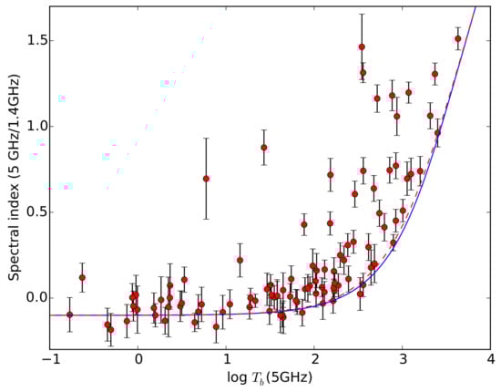 The 5 GHz to 1.4 GHz spectral index as a function of brightness temperature at 5 GHz for uniform (blue line) and spherical models (red dashed line) for = 10,000 K.