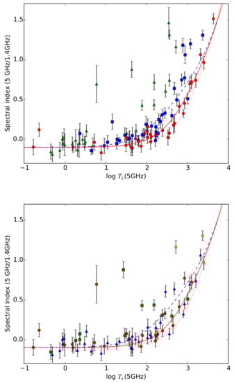 The 5 GHz to 1.4 GHz spectral index as a function of brightness temperature at 5 GHz. The solid red line and blue dashed line denote a PES model with and and , respectively. The dotted line marks the spherical model. In the top figure, PNe are split into three groups with respect to the parameter: (red circles), (blue squares), and (green triangles). In the bottom figure, PNe are split according to morphological type: spherical (red circles), elliptical (blue triangles), bipolar (green squares), and multipolar PNe (yellow pentagons) (bottom).