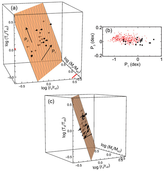(a) Black dots (pin heads) are the CLASH data in the space of , , , where kpc, , and keV are the sample geometric averages (log means) of , , and , respectively. The orange plane is the best fit of the data. The orange plane is translucent, and the grayish points are located below the plane. The lengths of the pins show the distance to the plane. The red bars show typical errors of the data. The arrow shows the direction to which the data distribution is most extended, and the arrow is perpendicular to on the plane. (b) The cross-section of the plane in (a). The large black dots are the CLASH data, and the small red dots are the MUSIC results shown in Figure 3. The latter is projected on the – plane determined for the former. The direction is the plane normal. Note that the scales of the vertical and horizontal axes are different. (c) The same as (a) but error bars for individual clusters are included. The viewing angle is changed so that the relation between the error bars and the plane is easily seen (Figure is reconstructed from Figure 1 of [23]).
