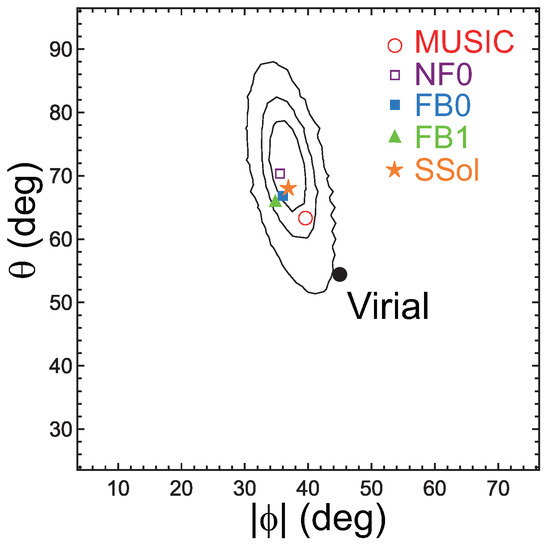 The angle of the plane normal in the space of ; is the angle between and the axis, and is the azimuthal angle around the axis, measured anti-clockwise from the axis. The contours are for the CLASH observational data showing the 68% (1), 90% and 99% confidence levels from inside to outside. The large black dot (Virial) is the prediction of the simplified dimensional analysis or and is rejected at the >99% level. The directions of the plane normals estimated for the simulation samples MUSIC, NF0, FB0, and FB1 are shown by the open red circle, the open purple square, the filled blue square, and the filled green triangle, respectively. The prediction of the similarity solution (Equation (9) for ) is shown by the orange star (SSol) (Figure is reconstructed from Figure 2 of [23]).