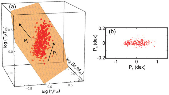 (a) Red dots (pin heads) are the results of the adiabatic MUSIC simulations (). The axes are normalized by the average parameters of the sample ( kpc, , and keV). The orange plane is the best fit of the data. The arrow shows the direction to which the data distribution is most extended, and the arrow is perpendicular to on the plane. (b) The cross-section of the plane in (a). The direction is the plane normal (Figure is reconstructed from Figure 3 of [23]).