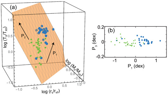 (a) The results of simulations including radiative cooling and feedback. The blue (FB0) and the green dots (FB1) are the results for and 1, respectively. The axes are normalized by the average parameters of the combined sample ( kpc, , and keV). The orange plane is the best fit of the data. The arrow shows the direction to which the data distribution is most extended, and the arrow is perpendicular to on the plane. (b) The cross-section of the plane in (a). The direction is the plane normal (Figure is reconstructed from Figure 4 of [23]).