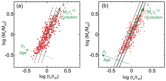 Figure 5 shows the projection of the fundamental plane shown in Figure 3 on the – plane. The solid arrow is parallel to the line of along which the distribution of the MUSIC clusters (red points) is elongated. This direction is also close to that of cluster evolution () in Figure 4 projected on the – plane [23]. Since we assumed that and , the line corresponds to the first relation of Equation (7) when . Considering the derivation of the relations in Equation (7) (see [41]), this indicates that the evolution of clusters on the fundamental plane reflects the spectrum of the initial density perturbations of the universe and follows [41]. Figure 5a also shows that the characteristic density decreases as a cluster moves in the direction of the solid arrow. While the formation redshift is formally related to the collapse time of the overdense region, in reality, it is often related to the time of major cluster mergers. That is, the formation redshift is reset when the cluster experiences a major merger, and estimated from for a given cluster at often corresponds to the time when the cluster underwent its last major merger. In fact, numerical simulations have shown that an individual cluster intermittently moves in the direction of the solid arrow in Figure 5 every time it undergoes mergers [23]. While the cluster temporarily deviates the general motion in the middle of a major merger, the deviation is confined in the fundamental plane and thus mergers do not much affect the thinness of the plane [23]. In other words, the effect of major cluster mergers introduces some random history that could be different for clusters of the same mass, but since the mergers move cluster properties within the limits of the plane, the scatter of the plane does not increase very much.