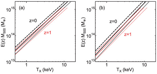 Thus, using Equation (11), can be represented as a function of for a given z. Figure 6a shows the results for using a general formula of developed by Correa et al. [15] instead of Equation (12). The slope is for and for (). The slope is close to but slightly smaller than . However, the derivation of the fundamental plane in Section 3 might be too simplified, and there might be some minor uncertainties on n [47]. In fact, if we take , the slope becomes for and for . Note that, even if we assume , the direction of the fundamental plane (Equation (9)) is consistent with observations and simulations [47]4. Thus, the relation of can be reproduced without the virial assumption or . Note that Figure 6 indicates that the red lines () are slightly below the black lines (). This may cause some bias about the slope index if clusters with various redshifts are plotted at the same time. For example, if higher-redshift clusters () tend to have smaller masses and lower temperatures than lower-redshift clusters (), the slope is slightly steepened (larger ). We note that Voit [57] (see also [58]) already addressed this issue. He considered accretion history of clusters and the effects of cluster surfaces as we do. While we focused on the inner structure of clusters, he studied the evolution of global properties of clusters. He concluded that the approximate agreement between the – relation derived via the traditional collapse model (Equation (10)) and those of simulations and observations is largely coincidental. Although our approach is different, our results support the conclusion.
