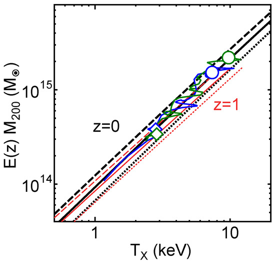 The density is represented by , where is the Hubble parameter at redshift z normalized by the current value . Equation (3) is associated with Assumption (i). From Assumptions (ii) and (iii), we obtain . Eliminating by using the relation , the mass–temperature relation is obtained: