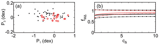 Figure 8a shows the cross sections of the fundamental plane. The red open circles are the clusters of the CLASH sample [24], for which and are derived through gravitational lensing. The black dots are those of an X-ray sample [60], for which and are derived through X-ray observations assuming that the ICM is in hydrostatic equilibrium. We discuss the fundamental plane formed by the CLASH sample (CFP) and the one formed by the X-ray sample (XFP) separately. Fixing the direction of the plane normals at the one shown by SSol in Figure 2, the distance between the two fundamental planes is estimated to be dex in the space of . Thus, the position of the fundamental planes are consistent with each other. However, the XFP seems to be located slightly above the CFP in Figure 8a. The shift may be caused by a possible systematic difference of observed or between CFP and XFP because they are obtained through different methods (gravitational lensing and X-ray observations). The plane shift in the direction of or can be estimated from . Then, assuming the NFW profile (Equation (1) or (2)), the shift in the direction of can be derived [47].