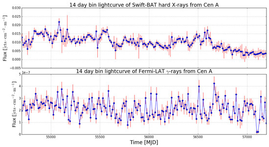 High-energy -ray () observations of Cen A that were contemporaneous to the Swift-BAT data, from the Large Area Telescope (LAT), the primary instrument on board the Fermi gamma-ray Space Telescope (Fermi) [18], were used to extract the -ray light curve. We employed the publicly available event reconstruction tool (Fermi-LAT Pass 8 event-level analysis) [19], which has been optimized for point-like sources after a comprehensive review of -ray event analysis. Released in 2015, Pass 8 is considered to be the event reconstruction and analysis realizing the full scientific potential of the instrument by increasing the effective area, improving the point spread function, and widening the energy range to which LAT is sensitive. We performed unbinned likelihood analysis (a maximum likelihood optimization technique) as described in the LAT Cicerone (see [20]) to obtain the light curve in the energy range to 500 GeV within a region of interest centered at the position of Cen A. The LAT science tools include all Pass 8 background models, such as the galactic diffuse emission and the extragalactic isotropic diffuse emission models.