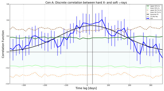 Figure 2 shows the discrete correlation function between hard X-rays and HE rays from Cen A. This is the correlation coefficient as a function of time-lag where the correlation was performed as described in Section 4.1. The shape of the peak in Figure 2 is approximately Gaussian for which the width is a measure of the uncertainty in the time lag. Overlaid on the correlation, is a band delimiting the confidence level (see Section 4.2) which is significantly surpassed by the peak of the correlation function. It can be noticed that the result hints to a scenario where the X-rays observed from the Swift-BAT instrument lead the Fermi-LAT -rays by days (see the peak of the Gaussian fit which has a standard deviation of 125 days). The correlation coefficient at the peak is . The result is established to have been significant above the 95% CL, but a correlation at a CL significance cannot be claimed due to the magnitude of the error bars.