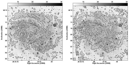 Polarized intensity and magnetic field maps of NGC6946 obtained by rotating the observed polarization maps by and by overlaying them on a black-and-white image from the 2nd digitized sky survey blue (DSS2 B; McLean et al. []). Left: C-band map. The contour intervals are (3, 6, 12, 24, 48 and 96) × 20 Jy/beam. Right: X-band map. The contour intervals are (3, 6, 12, 24, 48 and 96) × 13 Jy/beam.