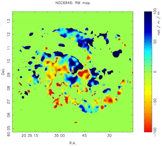 where L is the line of sight length, is the line-of-sight component of the magnetic field, and is the thermal electron density, respectively. The sign of the RM is defined to be positive so that the magnetic field vector is directed from the source toward us []. Since polarization maps in lower frequencies than 1.5 GHz have different Faraday depths according to Han [], it would be difficult to obtain the RM map correctly in the lower frequency than 1.5 GHz. These problems can be avoided by using C and X band data. The orientation of the magnetic field can be estimated from a polarization map of the synchrotron radiation at a higher frequency. In this study, we assumed that the synchrotron emission only arose from a galactic disk, and that the Faraday rotation occurred mainly within the galactic disk. The geometrical orientation of the galactic disk was determined based on the assumption that the spiral structure was trailing. The ambiguity of each polarization angle was addressed based on the sign of the RM as explained in the following section, and the direction of the magnetic field was determined accordingly. Herein, we used an infrared image acquired by the wide-field infrared survey explorer (WISE; Wright et al. []) to trace the spiral arms and the velocity field acquired from the HI nearby galaxy survey (THINGS; Walter et al. []). Based on the THINGS and WISE data we can identify the northwest side of NGC6946 which is nearer to us.
