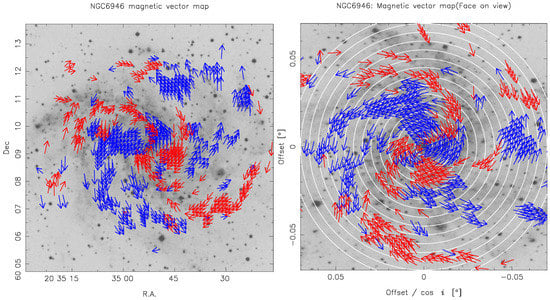 Following the method presented by Nakanishi et al. [], we derived a vector map as follows: (1) determining the geometrical orientation of the stellar disk assuming that spiral arms are trailing using the infrared image and the velocity field, (2) obtaining orientations of vectors based on the polarization map at the higher frequency, (3) determining the directions of vectors based on the sign of RMs. As described in Nakanishi et al. [], data with small absolute value of RM need to be omitted because this method is sensitive to the sign of RM. A magnetic vector map is, thus, obtained as shown in left panel of Figure 4. The right panel of Figure 4 shows face-on views of the magnetic vector map. The face-on view map shown in the left panel was made as follows: (1) rotating the figure on the left panel by clockwise so that the major axis is parallel to the y axis, (2) stretching the rotated image by 1/cos i in the x axis direction to face-on view.