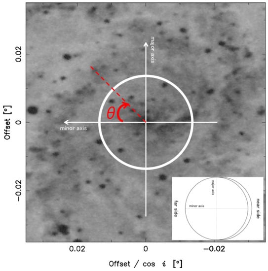 We examined the azimuthal variations in terms of (1) the pitch angle of magnetic vector and (2) the angle of the magnetic vector by constructing the face-on view map, as shown in the right panel of Figure 4. The azimuth was defined as an angle measured clockwise from the far end of the minor axis, as shown in Figure 5.