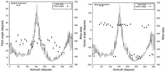 The azimuthal variation of the magnetic pitch angle of NGC6946 is shown in left panel of Figure 6. Plotted dots are obtained from the annulus between the circles with radii of 0.68 and 2.04 kpc. The dots in Figure 6 are averaged values in the azimuth ranges equals to half of the spatial resolution (≃) at radius of 1.36 kpc. In averaging values in different radii, the azimuthal angle was shifted by with relation to that of radius kpc using the magnetic pitch angle p, which was taken to be based on a former work [] to eliminate an effect of windings along spiral arms. The dots in left panel of Figure 6 represent the pitch angle of the magnetic field (dots and error bars denote mean values and standard deviations, respectively), the solid lines represent the brightness of the WISE data, and the peaks correspond to positions of the spiral arms. Looking at the ranges of the inter-arm regions (–, –) in Figure 6, the azimuthal variation of the magnetic pitch angle changes continually in the inter-arm regions. However, it changes rapidly by approximately around azimuthal angles of and , where stellar spiral arms exist.