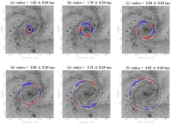 Figure 8 shows the azimuthal variations of the magnetic vector angles in the the annulus between the circles with radii of 3.40 and 4.76 kpc, which corresponds to panels of (e) and (f) of Figure 7. The dots are averaged values in the azimuth width of , which is equivalent to the spatial resolution in the case of radius of 4.08 kpc. Figure 8 shows that there exist four reversals around , , , and whereas six reversals were found in the inner region. This fact implies that the number of reversals of magnetic field might change with the radius. The mode of m = 2 identified in the outer regions agrees with Rohde et al. [], who mentioned that magnetic field structure is superposition of m = 0 and m = 2 modes based on the mean-field dynamo theory.