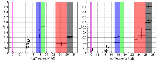 Comparison of vs. frequency of Mrk 421 (left plot) and Mrk 501 (right plot). The data points are taken from [4,10], where different instruments were used. The energy ranges used in this study are indicated as shaded areas.