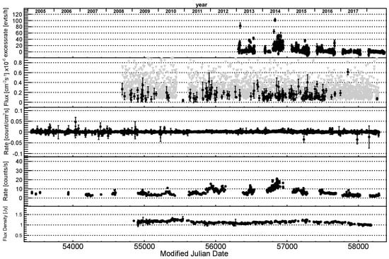 - Krimm, H.A.; Holland, S.T.; Corbet, R.H.D.; Pearlman, A.B.; Romano, P.; Kennea, J.A.; Bloom, J.S.; Barthelmy, S.D.; Baumgartner, W.H.; Cummings, J.R.; et al. The swift/bat hard x-ray transient monitor. Astrophys. J. Suppl. Ser. 2013, 209, 14. [Google Scholar] [CrossRef]