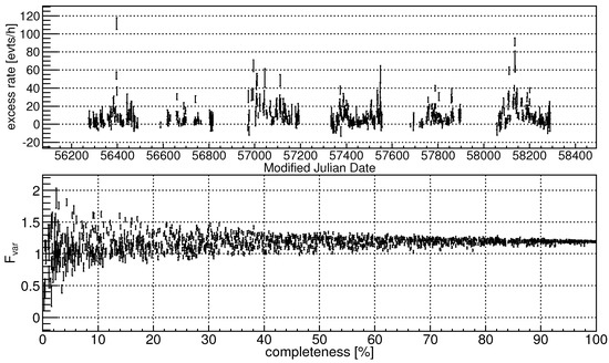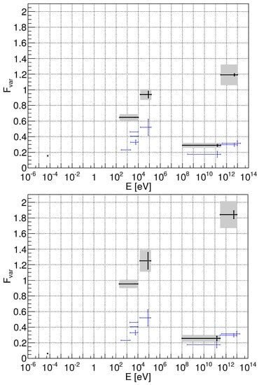 The fractional variability itself does not use any timing information of the light curve, because of this, it is necessary to be very careful in choosing the data sample and interpreting the result. The studied time scale of the variability is limited by the time binning and cadence of the data sample. Another important point is that gaps in the sample have an impact on the outcome of a variability study, and for comparing data from different instruments only simultaneous data can be easily interpreted. As fast variability on time scales from minutes to hours has been seen in blazars [23,24], this means that nonsimultaneous data could result in light curves lacking flaring activities in one band and therefore different results in Fvar, which would naturally have a larger impact in smaller data samples.