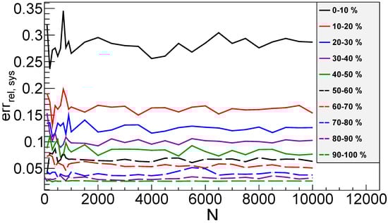 To evaluate how large N has to be, i.e., how often the procedure needs to be repeated, we study the relative uncertainty versus N. For this, we calculate the 16% and 84% quantile for each 10% bin in Figure 5 and plot the relative value with respect to N (see Figure 6). For small N, the 16% and 84% quantiles fluctuate as expected; but for large N (N > 6000), the relative uncertainty converges. For the further steps in the study, we use the relative uncertainty calculated with N = 10,000.