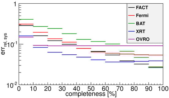 This procedure is repeated for every data sample of the different instruments in order to calculate the systematic uncertainty introduced by an incomplete multi-wavelength data sample. The result is shown in Figure 7. Like expected, there is a systematic error when using an incomplete data sample. This error decreases with the completeness of the data sample.