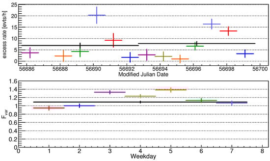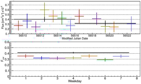 The upper plot of Figure 8 shows a zoom on the FACT light curve of two weeks. The different colors indicate the individual weekdays and the black points show the weekly binned excess rate. The lower plot compares the fractional variability of each weekday with the weekly fractional variability. One can see that the value of the fractional variability would vary by 27%, if only one observation per week was available. Still, the values of the individual days scatter around the weekly value.