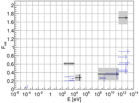 vs. energy for the time of FACT data for Mrk501. The black errors are the statistical errors for the fractional variability, and the gray boxes are the systematic uncertainty introduced by the incompleteness of the data samples. The blue points are the historical data from Figure 2.