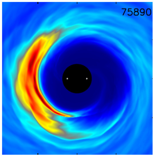 A feature also known from protoplanetary disks are overdense accretion streams across the secondary binary component. Two such dense accretion streams are readily identified in circumbinary accretion disks around SMBH binaries, too, see Figure 2. A persistent, non-axisymmetric overdensity, termed a “lump” and its implications were studied in detail in [55,61,69,70], see Figure 1. Such a feature is thought to arise due to non-accreting matter being repeatedly sloshed back towards the inner edge of the circumbinary disk. The gas that is driven back out, is ejected in a directionally preferred orientation, thereby gradually building up a somewhat local overdensity that then orbits near the inner edge of the disk. The lump exhibits overdensities of a factor of 4 over the average density in the rest of the disk and covers 1–2 radians in the azimuthal domain [69]. Crucially, in the relativistic treatment an mode appeared to dominate over modes seen in Newtonian studies [71]. Such a structure can similarly to the accretion streams produce coherent time variable signatures.