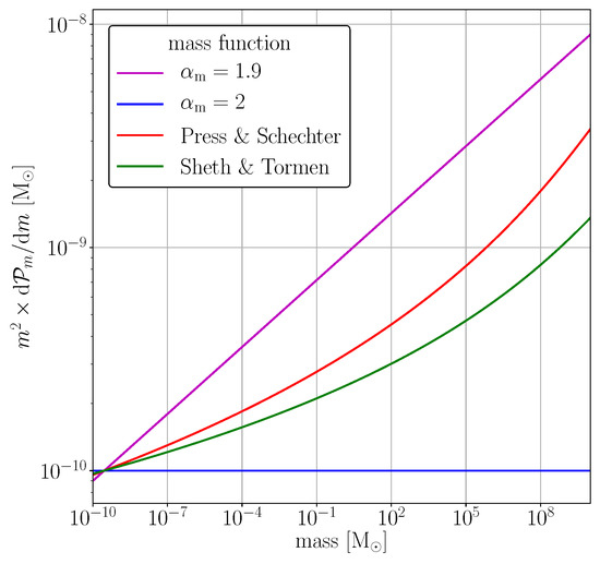 Mass function multiplied by . We show the prediction of Press and Schechter [37] (red line), Sheth and Tormen [38] (green line) as well as the power-law mass functions with index (magenta line) and (blue line). The Press–Schechter and Sheth–Tormen mass functions were computed for the cosmology of Planck 2018 [1] using the transfer function of Eisenstein and Hu [51] and a sharp-k filter. All mass functions are normalized to unity with .