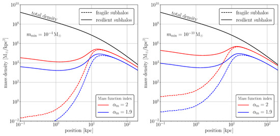 In Equation (5), is a dimensionless free parameter assumed universal, i.e., independent of the subhalo’s mass, concentration, or position. In SL17, the value of the disruption parameter was set to in agreement with numerical results (see, e.g., [59]). The results of van den Bosch and collaborators point toward a much lower value for . In this work, we consider two extreme values: and . The latter means a subhalo is disrupted when it has lost around 99.99% of its mass. In the following, we refer to these two configurations as “fragile subhalos” () and “resilient subhalos” (). The final subhalo phase-space density can now be written: