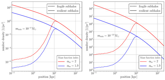The two normalization factors K can be computed using Equation (7), and we obtain the value of . The number of subhalos within the solar radius kpc is shown in Table 1. This number is highly sensitive to the parameters of mass function and , as already shown in Reference [35]. Furthermore, it is quite sensitive to : going from to , the number of subhalos increases by at least an order of magnitude. The impact of on subhalo mass and number density is investigated in the next section.