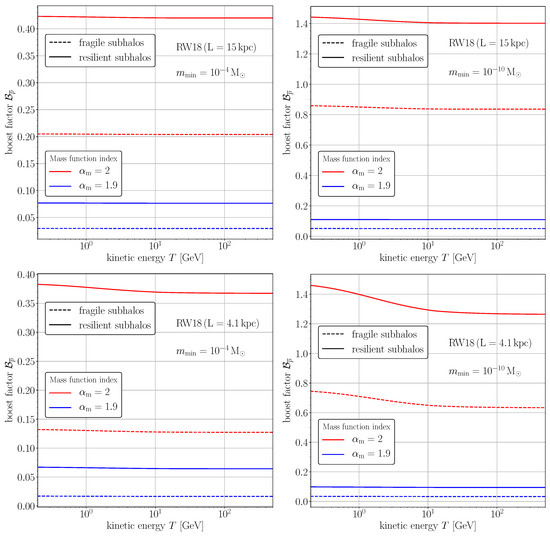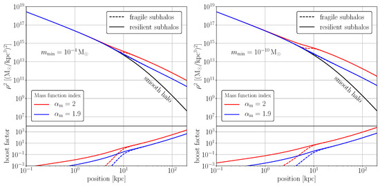 This is not quite the boost factor used in indirect searches, which is defined through a ratio of fluxes (see Equations (23) and 29)). The boost in Equation (20) is rather the local increase in the annihilation rate due to clustering. According to this definition, the boost is zero if , i.e., substructures are not included.2