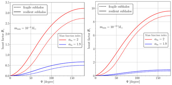 Left panel: gamma-ray boost factor as defined in Equation (23), as a function of angle between the direction of the galactic center and the line of sight, for a minimal subhalo mass of . We show the results for efficient tidal disruption (, dashed) and very resilient clumps (, solid). Right panel: same as left panel, for .